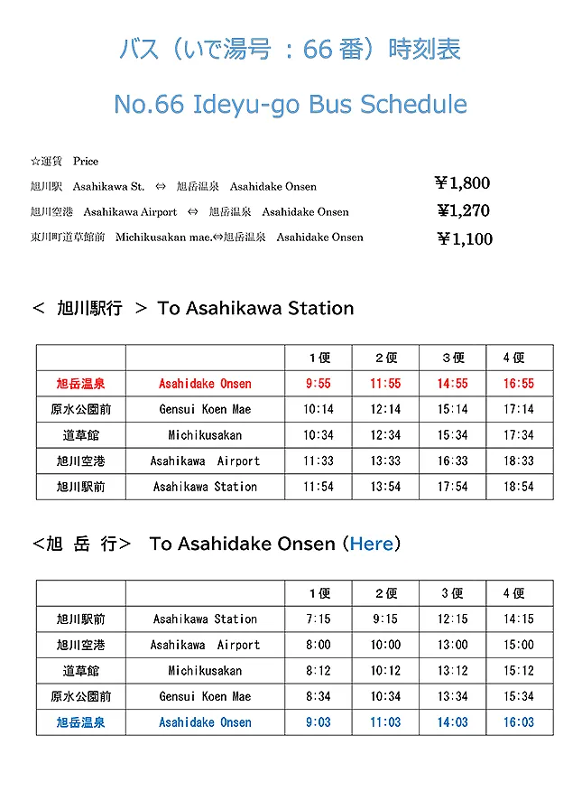 •  レンタカーの場合は、空港を出て最初の信号を右折。すぐに旭岳温泉への表示版が見えるので左折。